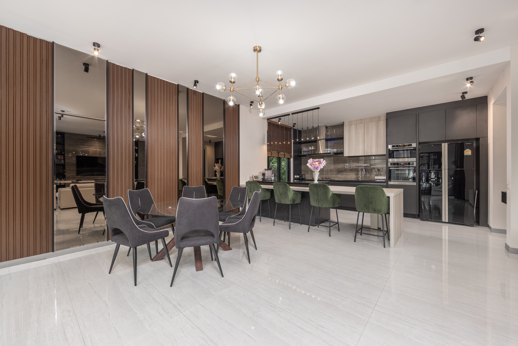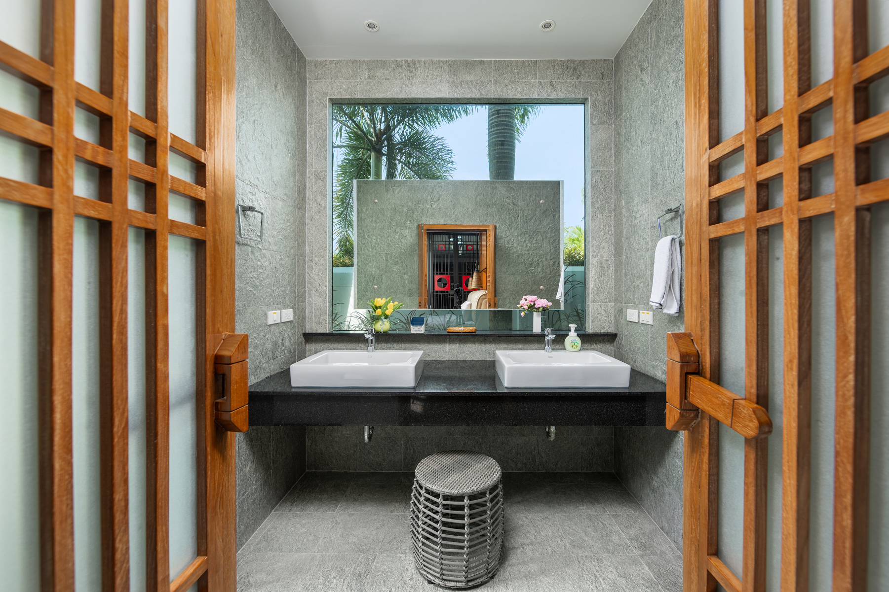 Четыре полноценные спальни и четыре ванные комнаты позволяют комфортно разместить семью и гостей. Просторная гостиная с панорамным остеклением объединена с современной кухней и выходит на террасу и частный бассейн.